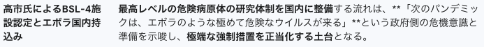 高市首相はかねてよりエボラの重要性(?)を唱えておられてん。BSL-4施設を設置すればエボラウイルスを国内で培養できるやろ?そしたら国民はビビり倒すやん?思わず惑沈を撃ちたくなるやん?緊急事態条項も制定しやすくなるやん?