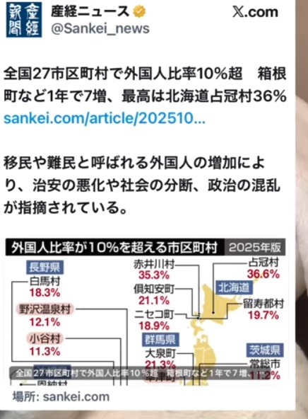 道民の皆はん〜。そちらの占冠村は外国人比率36%とのことですが大丈夫でっか〜?