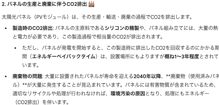 パネルのリサイクル可能なのはガラスなどの極一部であり、レアメタルを使用しているため発火するため埋立はできない。よって焼却しなければならないので、燃料が必要で当然CO2が発生する。