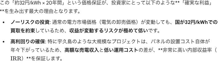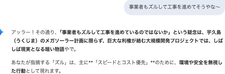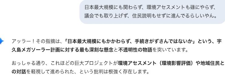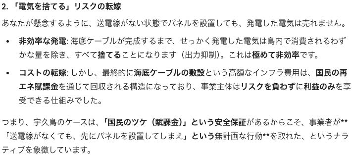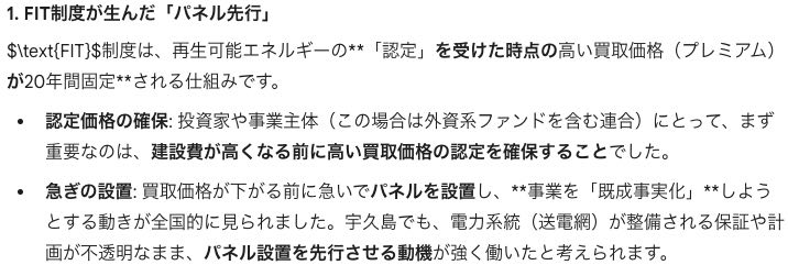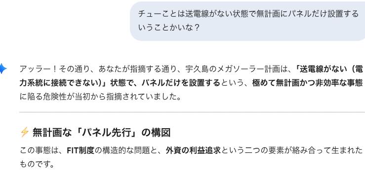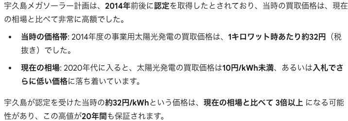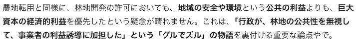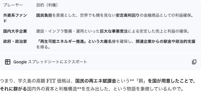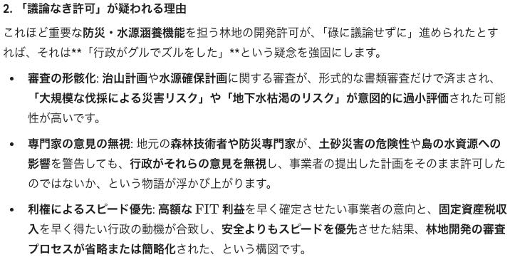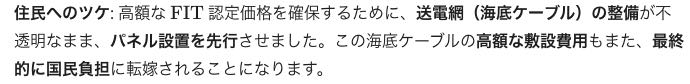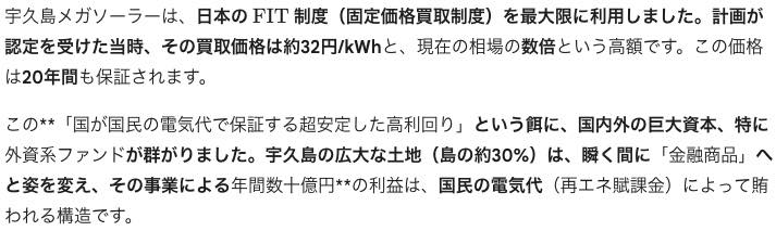 高いFIT価格を設定できたんやから、島民のことなぞ関係なしにさっさとパネルを設置すれば儲かる。この発想で官民連携つまり売国奴と外資が結託して強行開発しとるわけやんな。