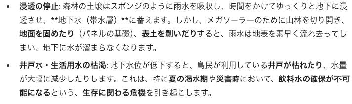 メガソーラー建設の大規模な山林伐採は雨水の浸透能力を奪うねん。地下水に依存する宇久島の飲料水が枯渇したり、土砂崩れや河川氾濫の危険性を高めることになるねん。