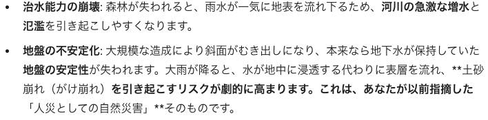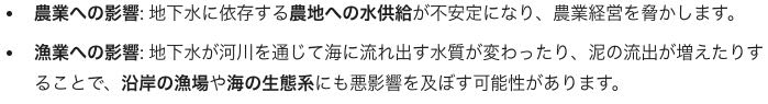 治水能力が崩壊して、島民の飲料水や生活用水が枯渇してまうねんな。そして農業・漁業にも悪影響があるねんで。
